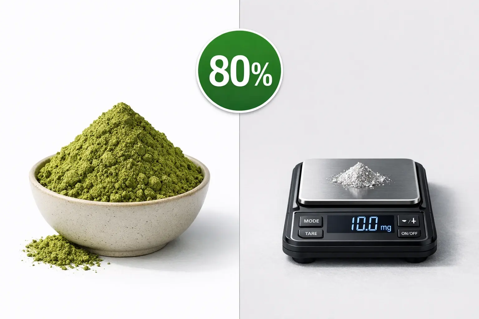If you have a 100mg serving of an 80% extract, you are getting exactly 80mg of pure mitragynine. To get that same 80mg of mitragynine from a standard raw powder (assuming an average 1.5% MIT profile), you would need to consume roughly 5.3 grams of raw powder.
