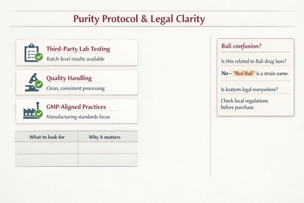 In the current wellness market, trust signals like GMP-aligned handling and third-party lab testing are no longer optional—they are your baseline for safety. Kratom Online commits to a philosophy of “unaltered, untouched, uncompromised” botanicals. Every batch of Red Bali Supreme is rigorously tested to verify its alkaloid density and to ensure it is entirely free from heavy metals, contaminants, or synthetic adulterants.